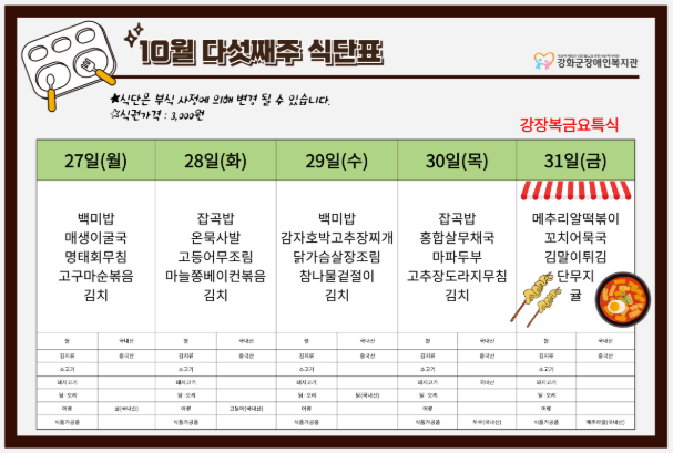 2025³â 10¿ù 5ÁÖ ½Ä´ÜÇ¥(10. 27. ~ 10. 31.)