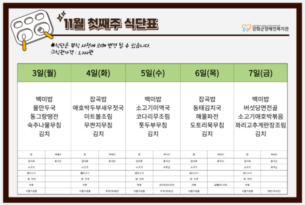 2025³â 11¿ù 1ÁÖ ½Ä´ÜÇ¥(11. 3. ~ 11. 7.)