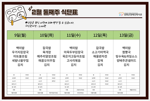 2026³â 2¿ù 2ÁÖ ½Ä´ÜÇ¥(2. 9. ~ 2. 13.)