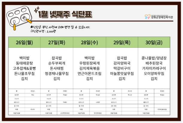 2026³â 1¿ù 4ÁÖ ½Ä´ÜÇ¥(1. 26. ~ 1. 30.)
