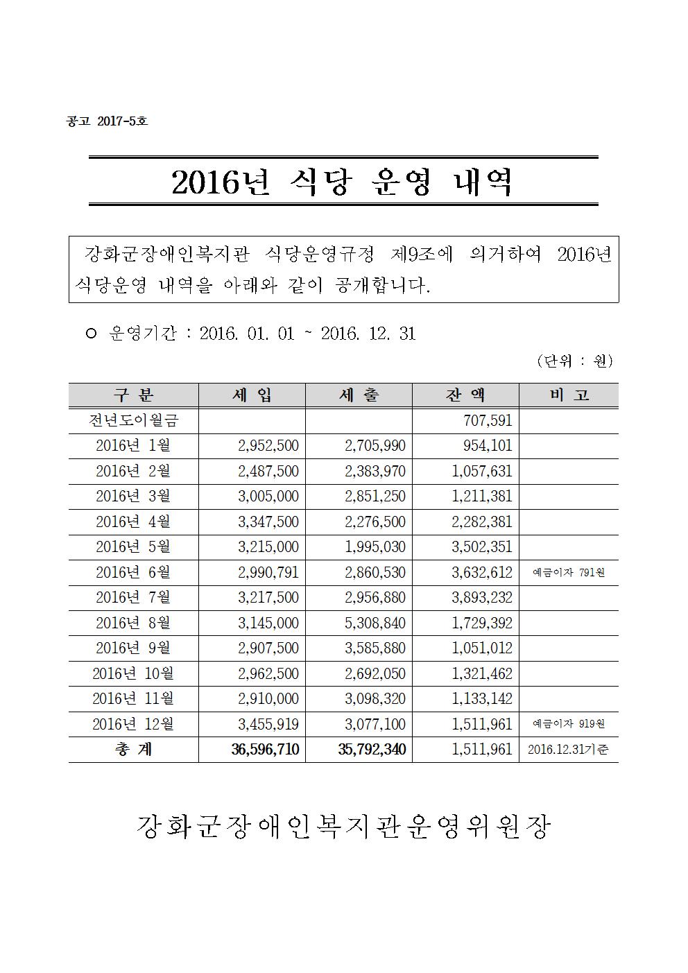 [°ø°í] 2016³â(1¿ù~12¿ù) ½Ä´ç ¿î¿µ ³»¿ª °ø°í