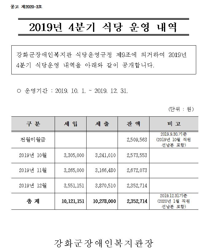 [°ø°í] 2019³â(10¿ù~12¿ù) 4ºÐ±â ½Ä´ç ¿î¿µ ³»¿ª °ø°í