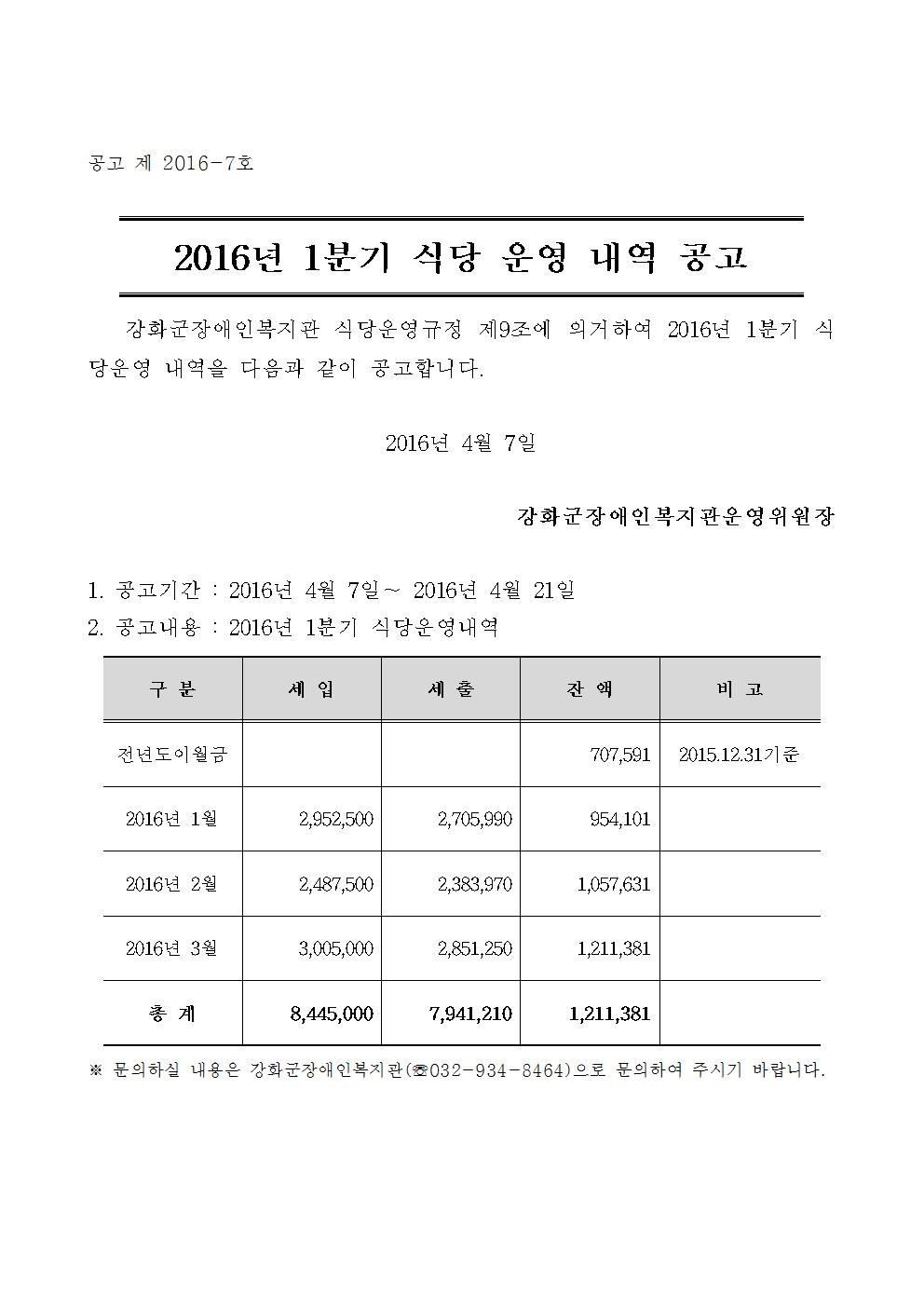 [°ø°í] 2016³â 1ºÐ±â ½Ä´ç ¿î¿µ ³»¿ª °ø°í
