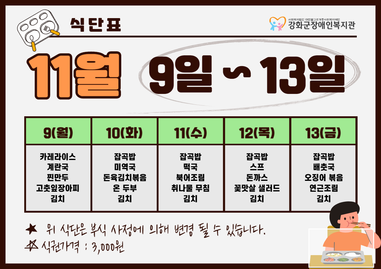 11¿ù µÑ° ÁÖ ½Ä´ÜÇ¥(11. 9. ~ 11. 13.)