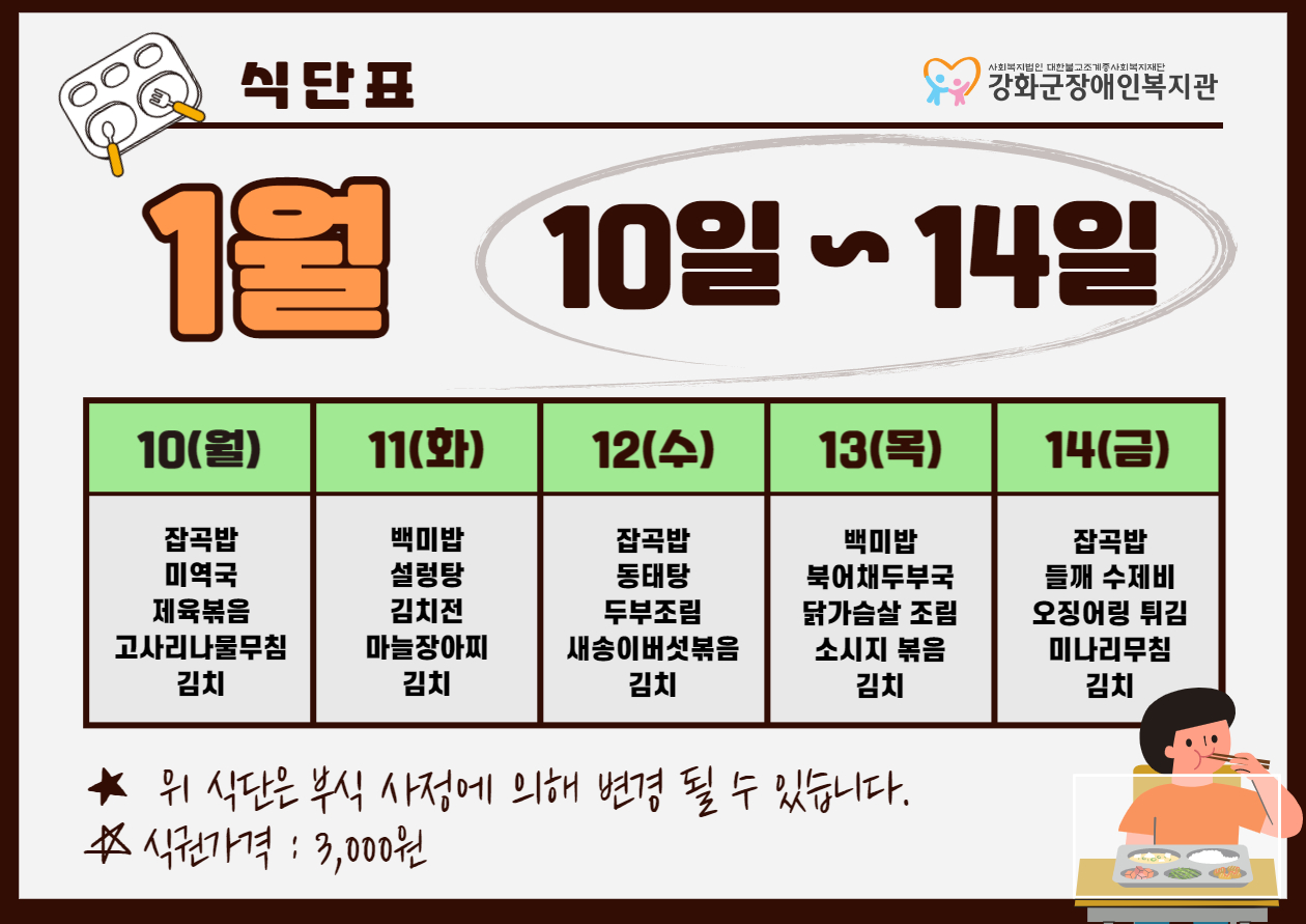 2022³â 1¿ù 2ÁÖ ½Ä´ÜÇ¥(1. 10. ~ 1. 14)