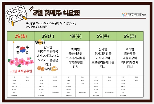 2026³â 3¿ù 1ÁÖ ½Ä´ÜÇ¥(3. 2. ~ 3. 6.)