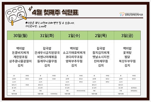 2026³â 4¿ù 1ÁÖ ½Ä´ÜÇ¥(3. 30. ~ 4. 3.)